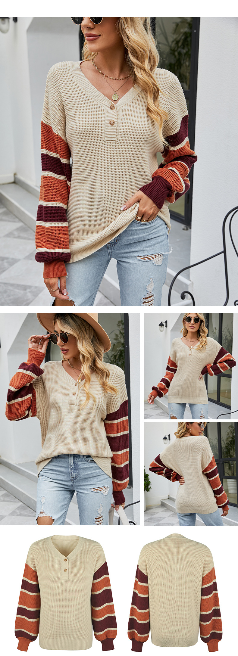 Striped Open-front Button-knit Lantern Sleeve Sweater Women